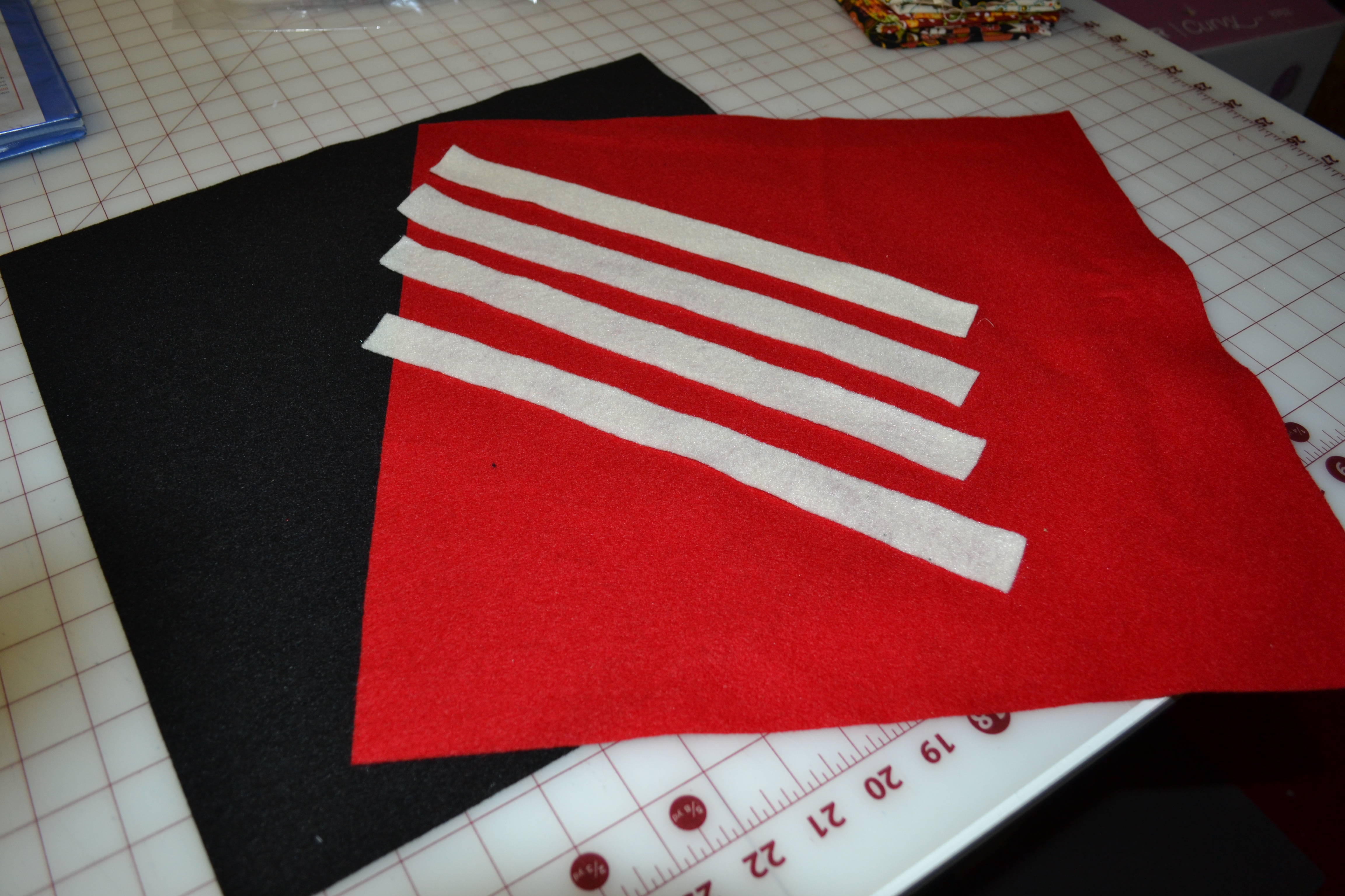Begin by cutting your base felt board pieces to 16 X 16. And cutting the white into 4 strips that measure 1″ X 12″.