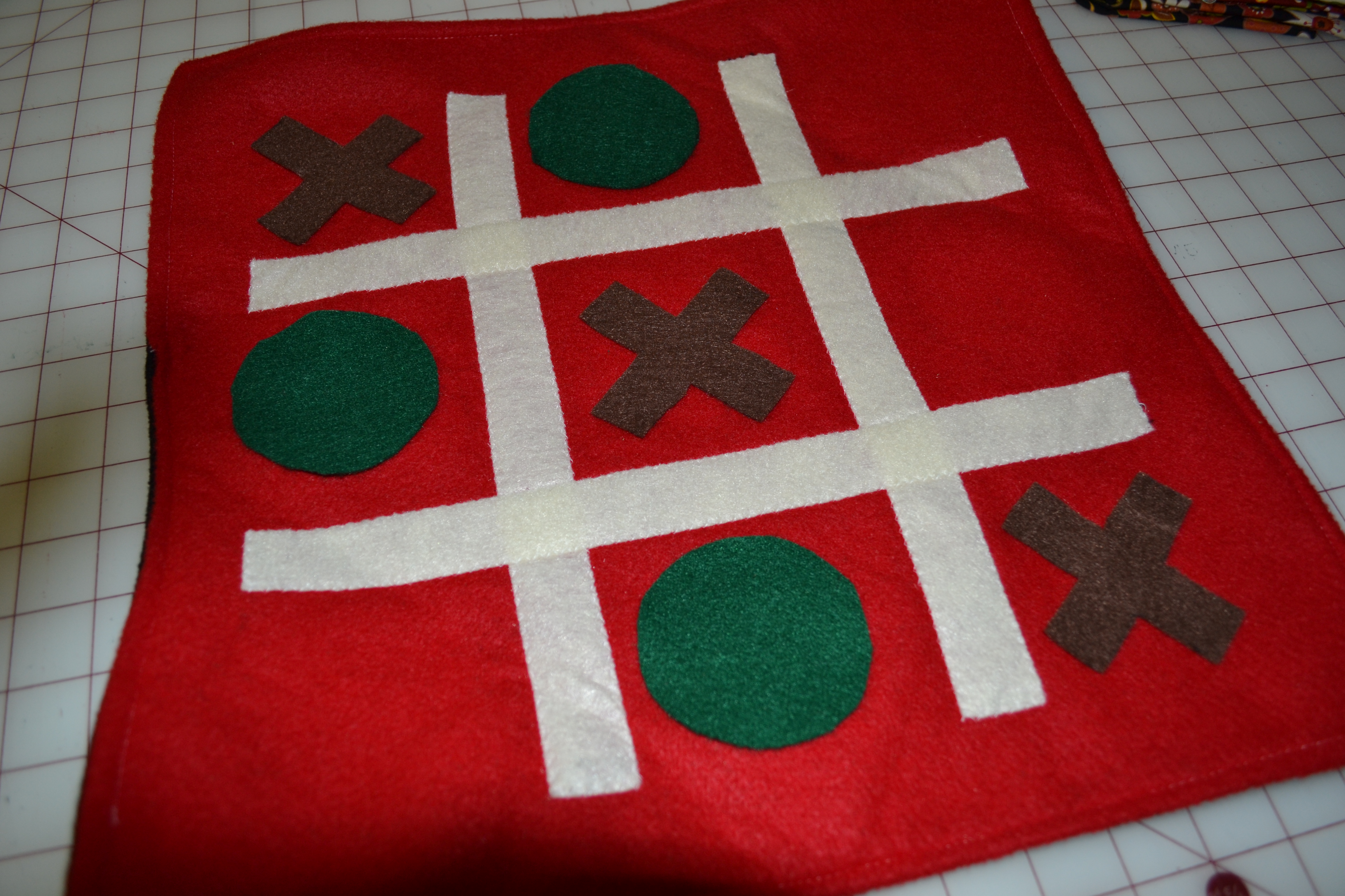 Now give your square felt board a quick press with an iron and stitch about 1/4″ all the way around making sure to close the opening left for turning. Your game board is complete.