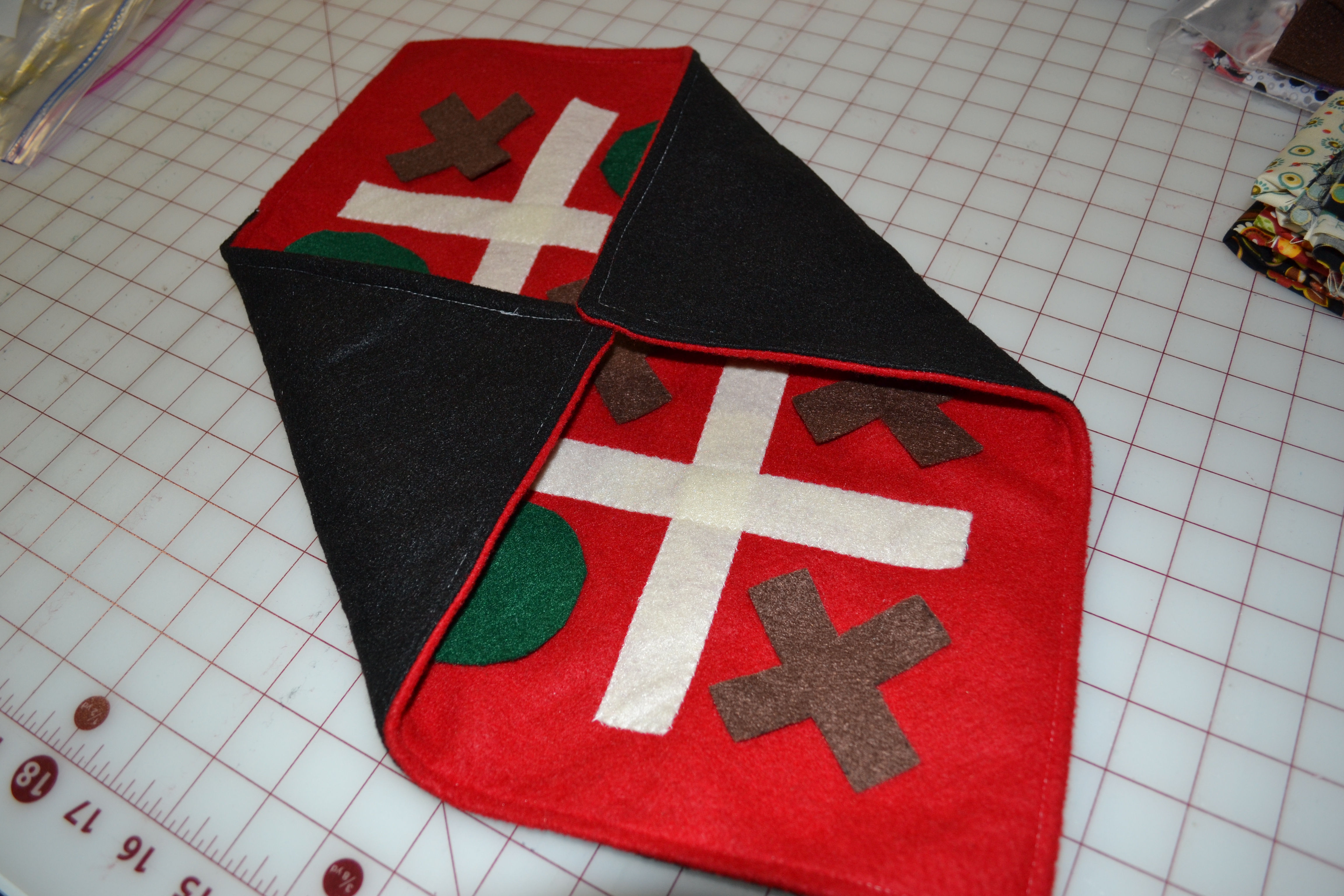 Lay all your game pieces onto the felt board where you have sewn the grid strips. Turn it so it looks like a diamond with the fastener sides pointing towards and away from you. Pull the left and the right corners in to the center. Fold the top corner and the bottom corners towards the center . Roll it up until the snaps meet and fasten.