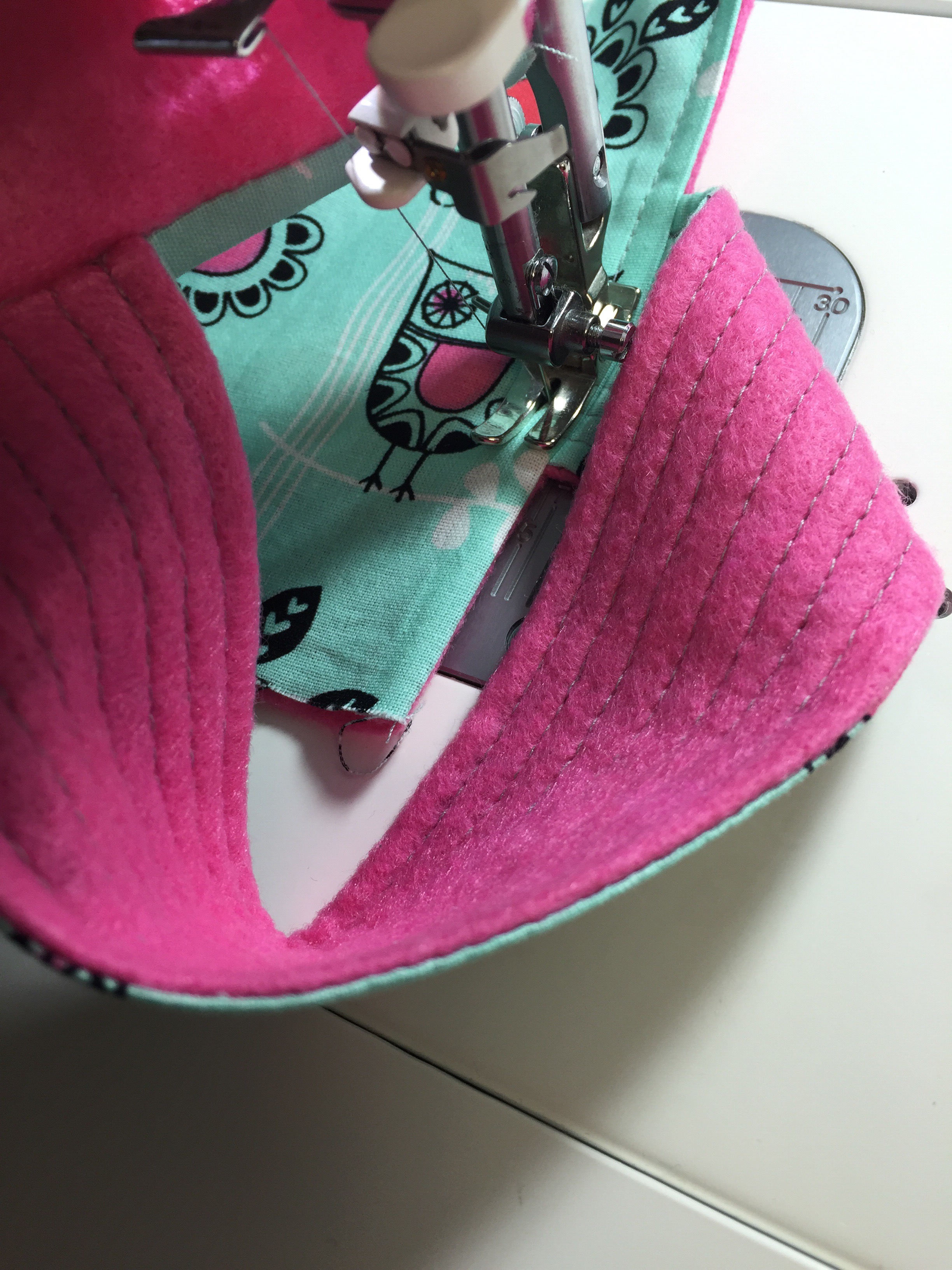 Top stitch around the top edge. It can feel a little fiddley with the handle but, just move it out of the way.