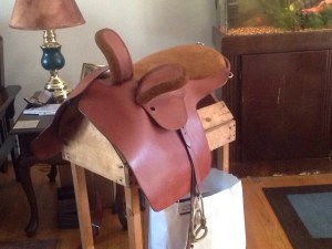 I am making a side-saddle apron for a woman who is involved in a neighboring county historical society. I like to challenge myself. And this has proven to be quite the challenge. In the meantime I have a saddle in my living room. At least, it matches my color scheme.